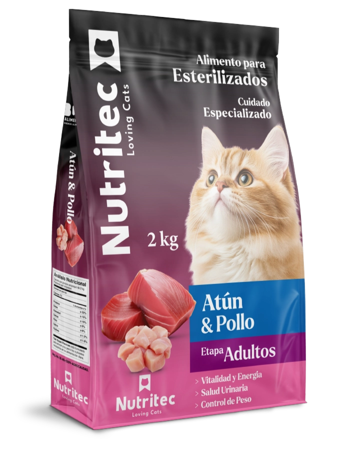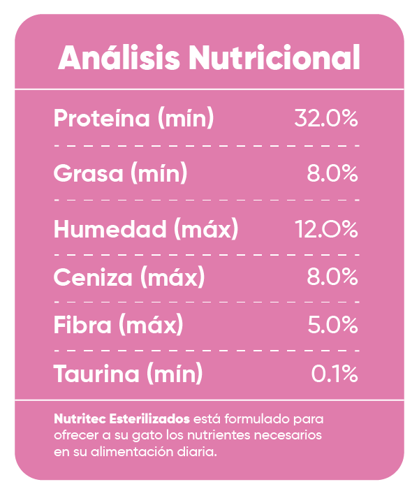 Harina de pollo, harina de atún, arroz, concentrado de soya altamente digestible, trigo, hidrolizado de proteínas vegetales y proteínas animales (pollo y/o cerdo), gluten de maíz, zanahoria deshidratada, pulpa de remolacha, levadura de cerveza, aceite de pollo y/o aceite de pescado, hidrolizado de hígado de pollo y/o cerdo líquido y polvo, fibras vegetales, cloruro de sodio, premezcla vitamínica-mineral (Vitamina A, Vitamina D3, Vitamina E, Vitamina K3, Vitamina B1, Vitamina B2, Vitamina B6, Vitamina B12, Vitamina C, niacina, ácido pantoténico, ácido fólico, biotina, cobre, hierro, manganeso, magnesio, yodo, zinc, selenio), extracto de yucca schidigera, fructo-oligosacáridos (FOS), manano-oligosacáridos (MOS), fuentes de luteína, colina natural, l-carnitina, DHA, taurina, lisina, acidificante, antimicótico, adsorbente de micotoxinas, antioxidante. Productos para esterilizados que te pueden interesar